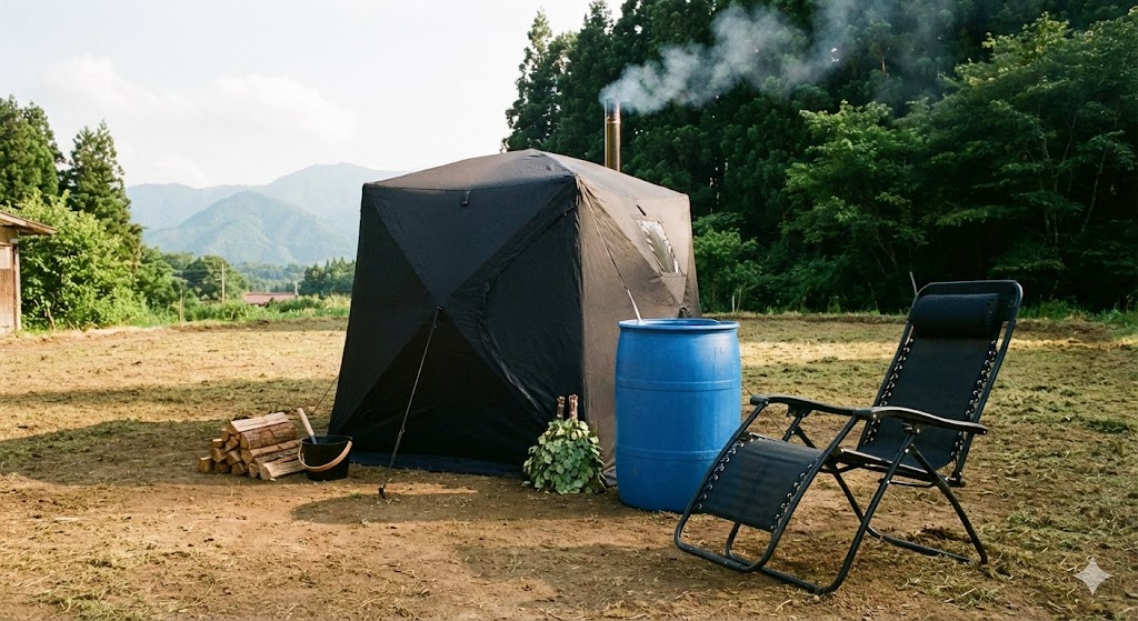 草を刈った平らな地面にテントサウナを設営。その横には、古民家によくある「井戸水」をなみなみと張ったドラム缶を設置します。井戸水は夏でも冷たく、サウナ愛好家にとっては「奇跡の水風呂」です。