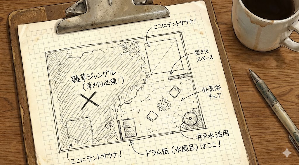ジャングルを切り拓き、そこにネットで買える「テントサウナ」と、ホームセンターの「ドラム缶」をドンと置く計画です。